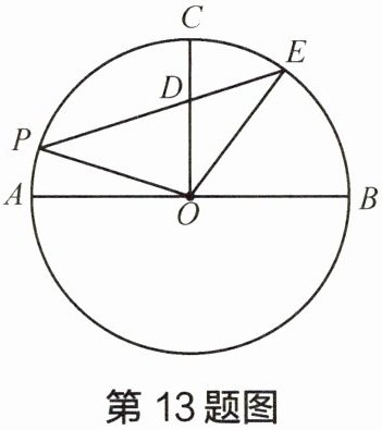 13 如图,$ AB $ 是 $ \odot O $ 的直径,$ OC $ 是垂直于 $ AB $ 的半径,过 $ \overset{\frown}{AC} $ 上一点 $ P $ 作弦 $ PE $,分别交 $ OC $ 和 $ \overset{\frown}{BC} $ 于 $ D $、$ E $ 两点,且 $ PO = PD $,试求 $ \overset{\frown}{AP} $ 和 $ \overset{\frown}{BE} $ 之间的数量关系。