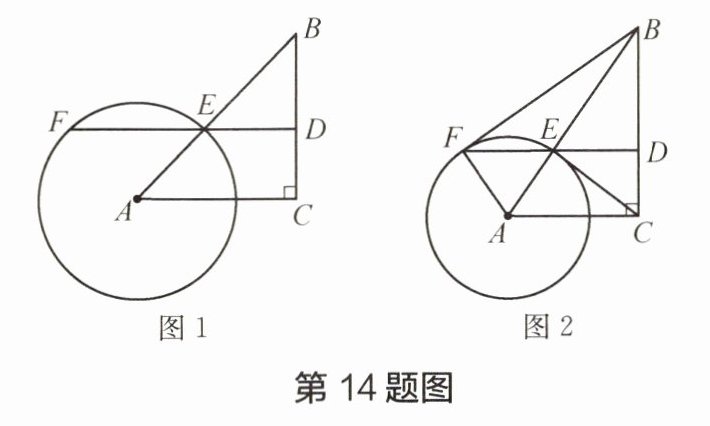 14 如图,在Rt△ABC中,∠ACB= 90°,AC= 2,点D、E分别在边BC、AB上,ED⊥BC,以AE为半径的⊙A交DE的延长线于点F。