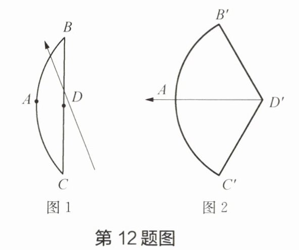 12 如图1,小杰制作了一副弓箭,点A、D分别是弓臂BAC与弓弦的中点,弓弦BC= 60cm,沿AD方向拉弓的过程中,假设弓臂始终保持圆弧,弓弦长度不变。如图2,当弓箭从D点拉到D'时,有AD'= 30cm,∠B'D'C'= 120°,求此时弓臂两端B'、C'之间的距离。