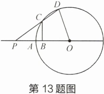 13 如图,已知⊙O的半径OA为4,P是OA延长线上的一点,过线段OP的中点B作OP的垂线交⊙O于点C,射线PC交⊙O于点D,联结OD,若⌢AC= ⌢CD,求弦CD的长。