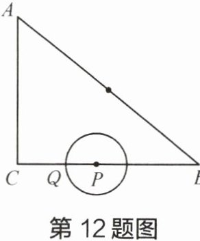 12 如图,在$Rt\triangle ABC$中,$\angle ACB= 90^{\circ}$,$AC= 6\mathrm{cm}$,$BC= 8\mathrm{cm}$。点$P为BC$的中点,动点$Q从点P$出发,沿射线$PC方向以2\mathrm{cm}/s$的速度运动,以点$P$为圆心,$PQ$长为半径作圆。设点$Q运动的时间为t$秒,当$t= 1.2$时,判断直线$AB与\odot P$的位置关系,并说明理由。