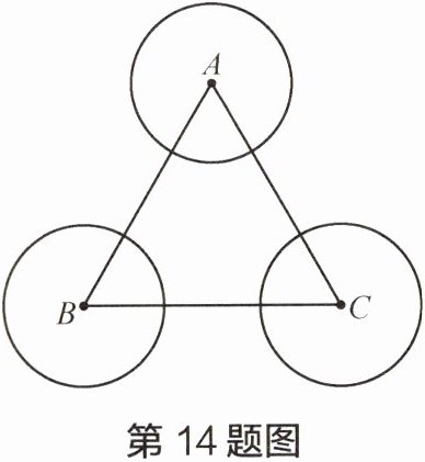 14 如图, 已知等边三角形$ABC$的边长为 4, 三个等圆$\odot A$、$\odot B$、$\odot C$的圆心分别在三角形的顶点上, 其半径长为$r$。$\odot D与\odot A$、$\odot B$、$\odot C$都相切。