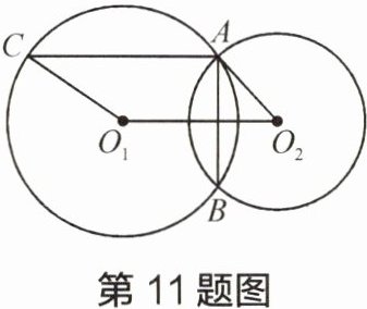 11 如图,已知$\odot O_{1}与\odot O_{2}相交于点A和点B$,$AC// O_{1}O_{2}$,交$\odot O_{1}于点C$,$\odot O_{1}$的半径为 5,$\odot O_{2}的半径为\sqrt{13}$,$AB = 6$,求四边形$ACO_{1}O_{2}$的面积。