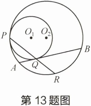 13 如图,$\odot O_{1}与\odot O_{2}内切于点P$,经过$\odot O_{1}上点Q的切线与\odot O_{2}相交于A$、$B$两点,直线$PQ交\odot O_{2}于点R$,求证:$\overset{\frown}{RA} = \overset{\frown}{RB}$。