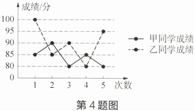 4 如图是甲、乙两同学五次数学测试成绩的折线图。比较甲、乙的成绩,下列说法正确的是(