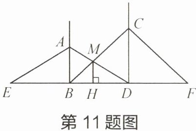 11 如图,$AB$和 $CD$两根电线杆,分别在高 $10m$的 $A$处和 $15m$的 $C$处用钢索将两杆固定,求钢索 $AD$与钢索 $BC$的交点 $M$离地面的高度 $MH$。