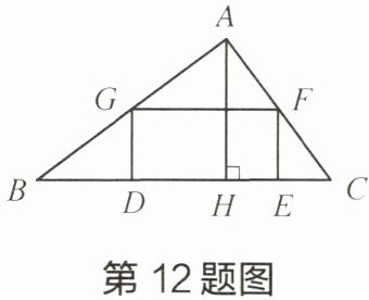 12 如图,在$\triangle ABC$中,$BC$为60,边 $BC$上的高 $AH$为40;矩形 $DEFG$的顶点 $D$、$E$在边 $BC$上,顶点 $G$、$F$分别在边 $AB$、$AC$上。设 $EF$的长为 $x$。