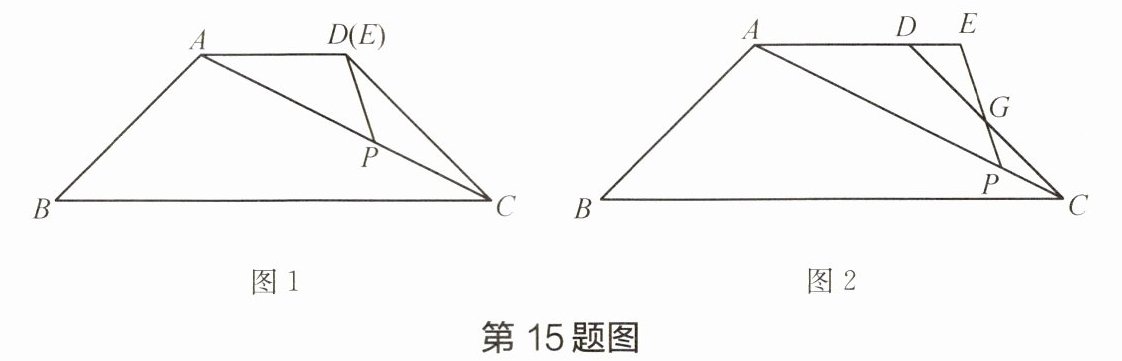 15 已知,在等腰梯形 $ABCD$中,$AD// BC$,$\angle B= \angle BCD = 45^{\circ}$,$AD = 3$,$BC = 9$,点 $P$是对角线 $AC$上的一个动点,且 $\angle APE= \angle B$,$PE$分别交射线 $AD$和射线 $CD$于点 $E$和点 $G$。