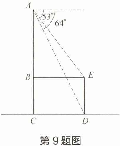 9 如图是放在水平地面上的一把椅子的侧面图,椅子高为 AC,椅面宽为 BE,椅脚高为 ED,且$AC⊥BE,AC⊥CD,AC// ED$。从点 A 测得点 D、点 E 的俯角分别为$64^{\circ }和53^{\circ }$。已知椅面宽$BE= 46cm$,求椅脚高 ED 的长(结果取整数)。