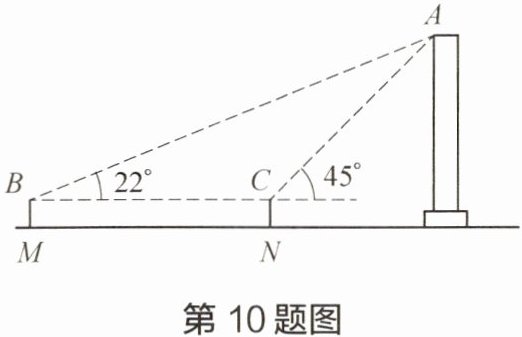 10 2021 年 4 月 29 日 11 时 23 分,中国空间站天和核心舱在海南文昌航天发射场发射升空,准确进入预定轨道,任务取得成功。某校航天兴趣小组的同学们构建数学模型,使用卷尺和测角仪测量天和核心舱的高度。如图所示,核心舱架设在 1 米高的稳固支架上,他们先在水平地面点 B 处测得天和核心舱最高点 A 的仰角为$22^{\circ }$,然后沿水平 MN 方向前进 24 米,到达点 C 处,测得点 A 的仰角为$45^{\circ }$,测角仪 MB 的高度为 1.6 米,求天和核心舱的高度(结果精确到 0.1 米,参考数据:$sin22^{\circ }\approx 0.37,cos22^{\circ }\approx 0.93,tan22^{\circ }\approx 0.40,\sqrt {2}\approx 1.41$)。