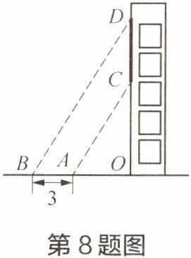 8 如图,小石同学在 A、B 两点分别测得某建筑物上条幅两端 C、D 两点的仰角均为$60^{\circ }$,若点 O、A、B 在同一直线上,A、B 两点间距离为 3 米,则条幅的高 CD 为