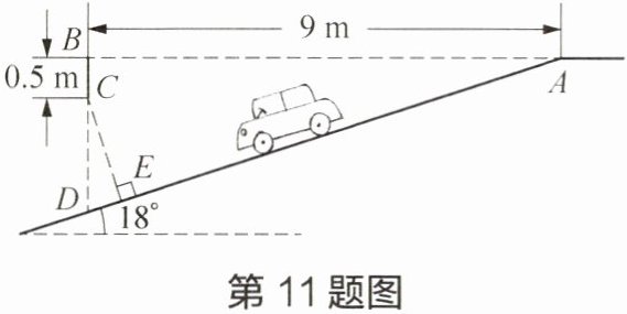 11 某商场为缓解我市“停车难”问题,拟建造地下停车库,如图是该地下停车库坡道入口的设计示意图。其中,$AB⊥BD,∠BAD= 18^{\circ }$,C在BD上,BC= 0.5m。车库坡道入口上方要张贴限高标志,以便告知驾驶员所驾车辆能否安全驶入。为标明限高,请你根据该图计算CE的长度(即点C到AD的距离)。(参考数据:$sin18^{\circ }\approx 0.31,cos18^{\circ }\approx 0.95,tan18^{\circ }\approx 0.33$)(结果精确到0.1m)