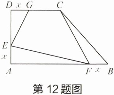 12 如图,在直角梯形 $ A B C D $ 中,$ \angle A = \angle D = 90 ^ { \circ } $,截取 $ A E = B F = D G = x $。已知 $ A B = 6 $,$ C D = 3 $,$ A D = 4 $。求四边形 $ C G E F $ 的面积 $ S $ 关于 $ x $ 的函数解析式和 $ x $ 的取值范围。