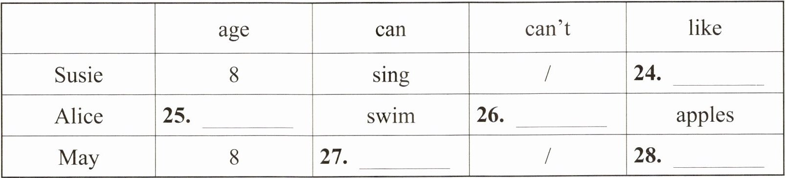 | Alice | 25. ______ | swim | 26. ______ | apples |