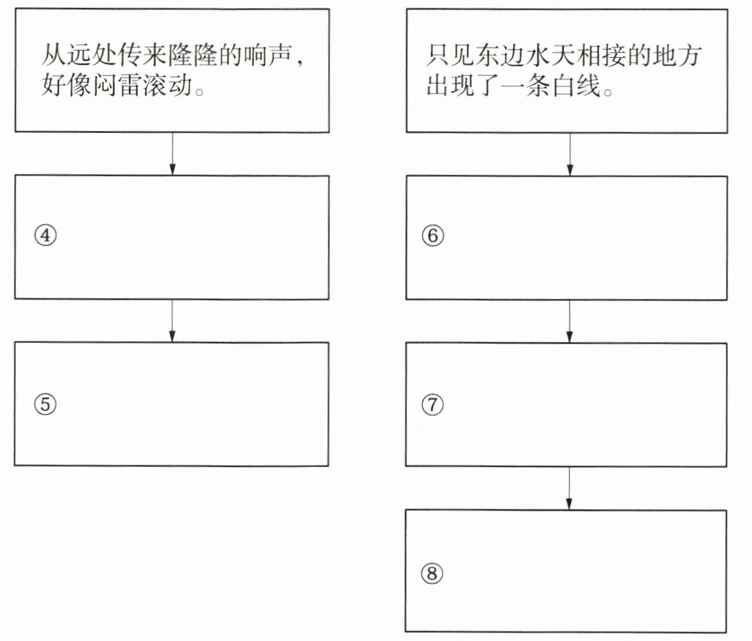 1 (1)人声鼎沸 (2)水天相接 (3)山崩地裂 2 齐头并进的千万匹白色战马浪潮迅速汹涌而来的雄伟气势 3 ① 由远及近 ② 声音 ③ 形态 ④ 过了一会儿,响声越来越大。 ⑤ 那声音如同山崩地裂,好像大地都被震得颤动起来。 ⑥ 那条白线很快地向我们移来,逐渐拉长,变粗,横贯江面。 ⑦ 再近些,只见白浪翻滚,形成一堵高高的水墙。 ⑧ 浪潮越来越近,犹如千万匹白色战马齐头并进,浩浩荡荡地飞奔而来。