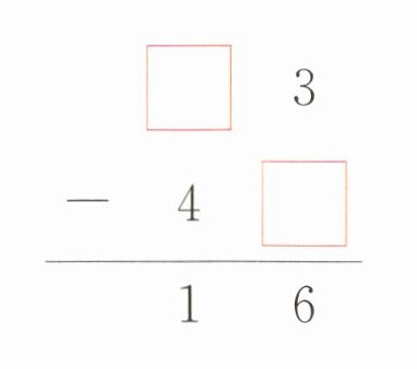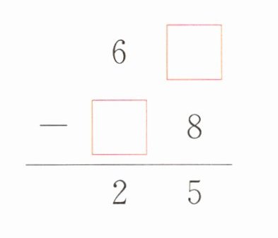 $\dfrac{\begin{array}{lll}& 6& □ \\ -& □ & 8\end{array} }{\begin{array}{lll}& 2& 5\end{array} }$ $\dfrac{\begin{array}{lll}& □ & 3\\ -& 4& □ \end{array} }{\begin{array}{lll}& 1& 6\end{array} }$
