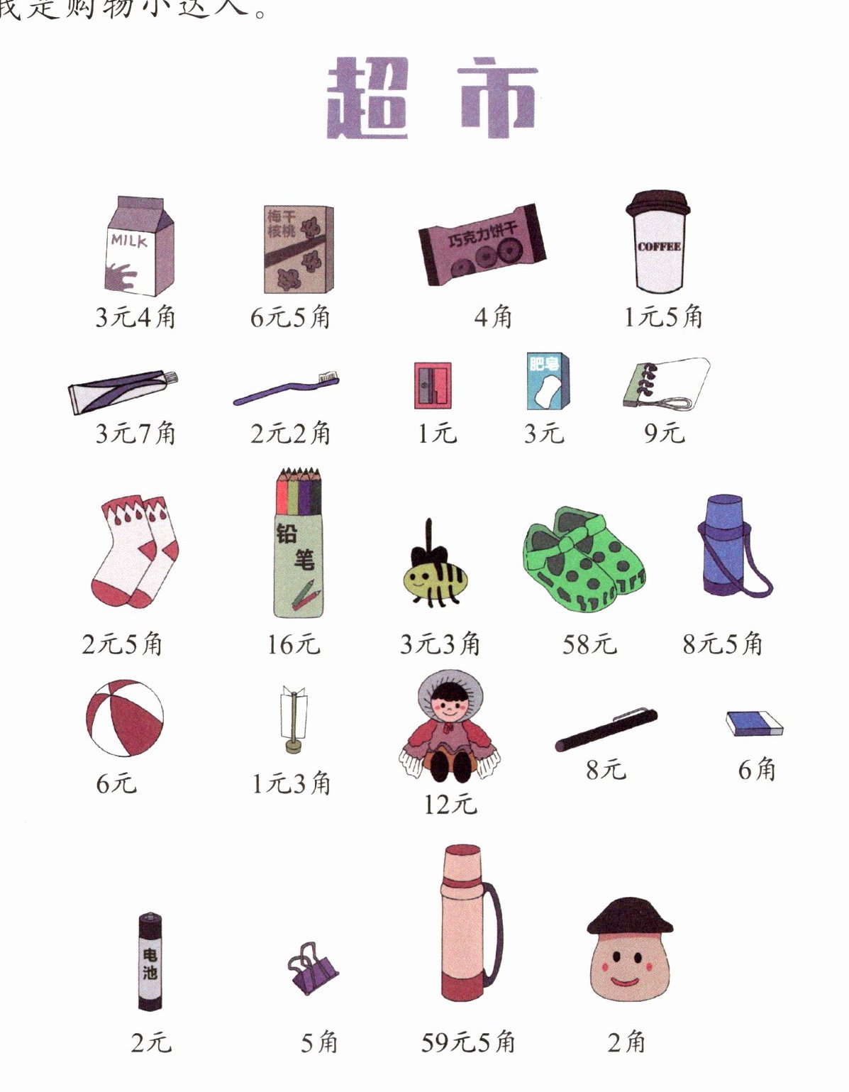 (2) 在超市中选择你喜欢的 5 种商品进行购买,你会怎么付钱? 把算式写下来。