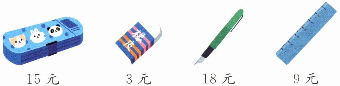 (1) 钢笔18元,尺子9元,问:钢笔比尺子贵多少元?算式:18-9=9(元)答:9元。