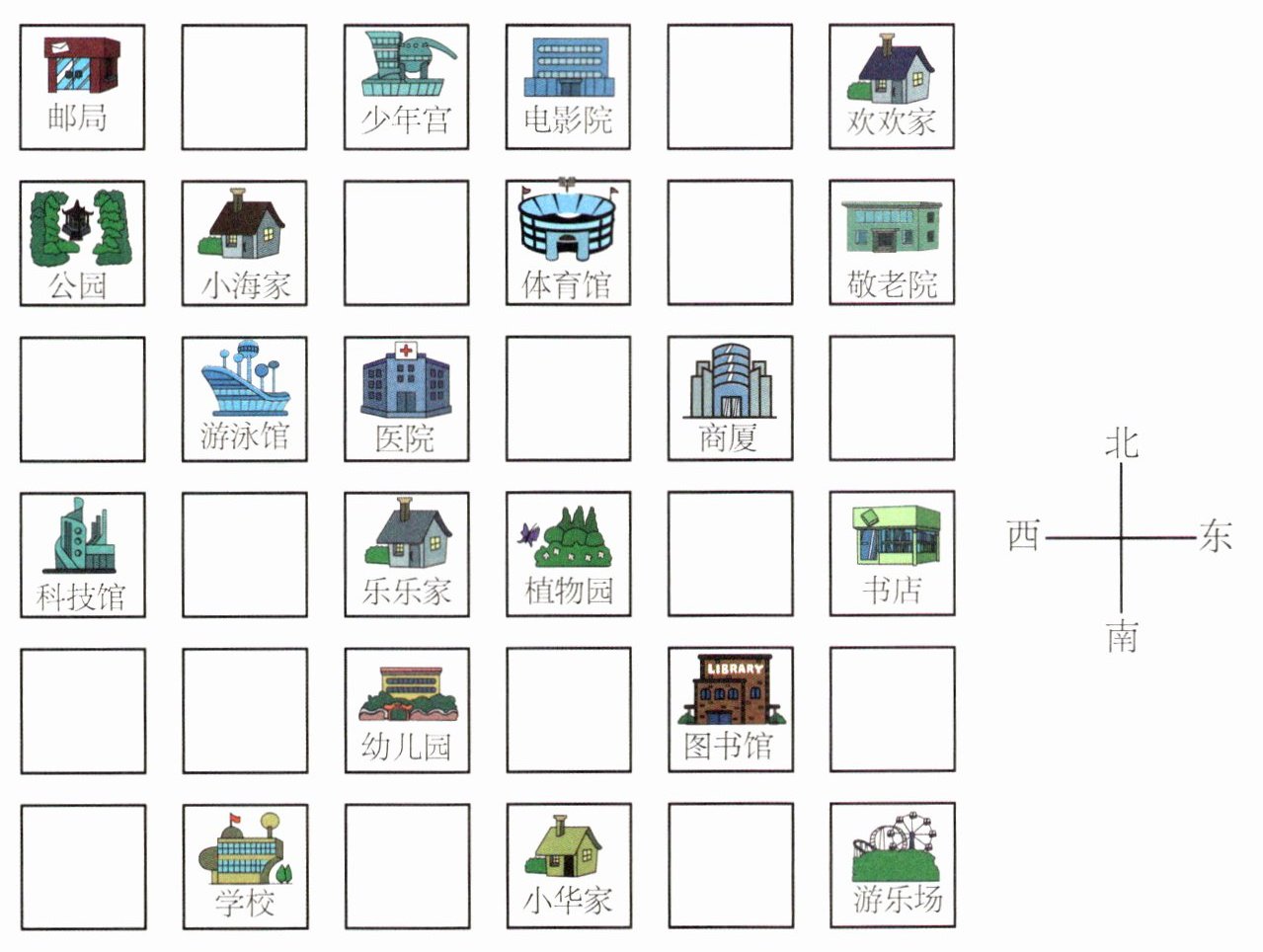 (1)少年宫 乐乐家、幼儿园 商厦 游泳馆 (2)南 西 南 东 北 南 (3)南 西(或西 南) 北 东(或东 北) 南 西(或西 南)