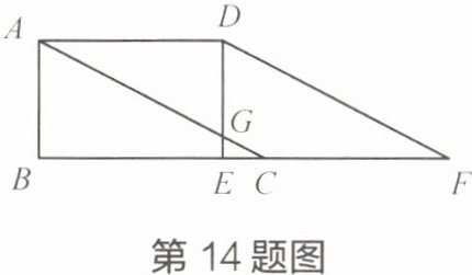 14 如图,在$\triangle ABC$中,已知$AB = a$,$BC = 2a$,$\angle B = 90^{\circ}$,将$\triangle ABC沿BC方向平移b个单位得\triangle DEF$(其中点$A$、点$B$、点$C的对应点分别是点D$、点$E$、点$F$),$DE交AC于点G$,$\triangle ADG的面积比\triangle CEG$的面积大 8,求代数式$a(a - b)$的值。