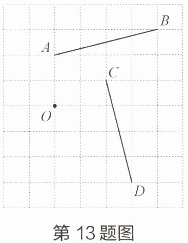 13 如图,有线段AB和线段CD在正方形网格中,小杰认为绕着点O旋转可以使线段AB和CD重合;小明认为要利用旋转和平移的知识,进行两种变换可以使线段AB和CD重合。请你判断他们的说法是否正确,并说明理由。