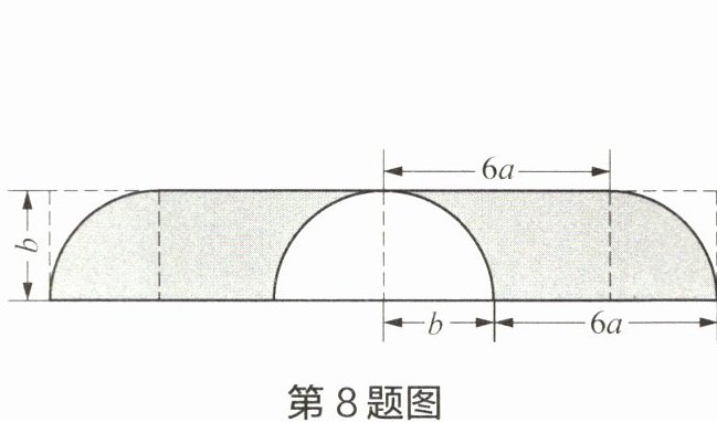 8 如图,为迎接国庆节,市区广场上设置了一个轴对称的平面造型,其正中间为一个半径为b的半圆,摆放花草,其余部分为展板区。已知a= 0.5米,b= 2米,那么展板的面积为____。