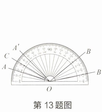13 如图,将量角器的中心与$\angle AOB$的顶点重合,读出射线$OA$、$OB$分别经过刻度18和140,把$\angle AOB绕点O顺时针方向旋转到\angle A'OB'$,读出$\angle AOA'的平分线OC$经过刻度32,那么$\angle AOB'$的度数是______。