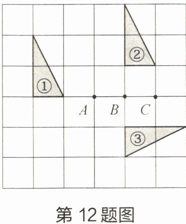 12 如图,在正方形网格中,图①经过______运动可以得到图②;图③是由图②绕点______顺时针旋转______得到的。