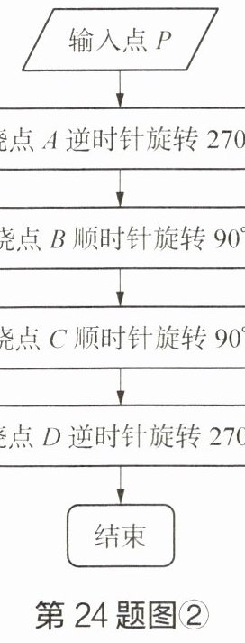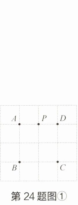 24 如图①是电子屏幕的局部示意图,$4×4$网格的每个小正方形边长均为1,每个小正方形顶点叫做格点,点$A$、$B$、$C$、$D$在格点上,光点$P从AD$的中点出发,按图②的程序移动。