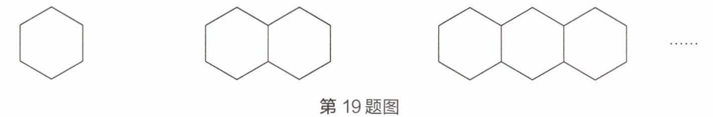 19 观察下图,其中第1个图形由1个正六边形组成,第2个图形由2个正六边形组成,第3个图形由3个正六边形组成,以此类推。那么第6个图形中共有____条线段;第$n$个图形中共有____条线段。(用含$n$的式子表示)
