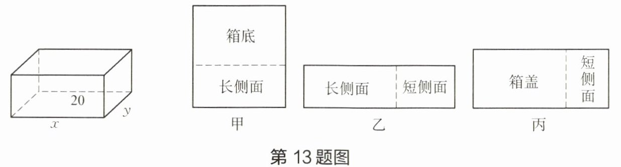 13 如图,用甲、乙、丙三块木板做一个长、宽、高分别为$x$厘米、$y厘米和20$厘米的长方体木箱。其中甲块木板锯成的两块刚好能做箱底和一个长侧面,乙块木板刚好能做一个长侧面和一个短侧面,丙块木板刚好能做一个箱盖和剩下的一个短侧面(厚度忽略不计,$x>y$)。