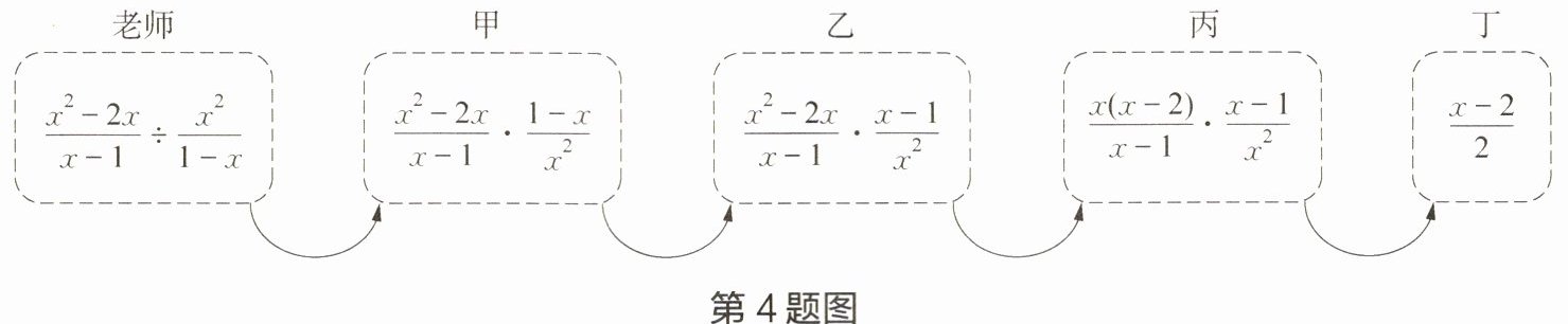 4 老师设计了接力游戏,用合作的方式完成分式化简。规则是:每人只能看到前一人给的式子,并进行一步计算,再将结果传递给下一人,最后完成化简。过程如图所示,接力中,自己负责的一步出现错误的是( )。