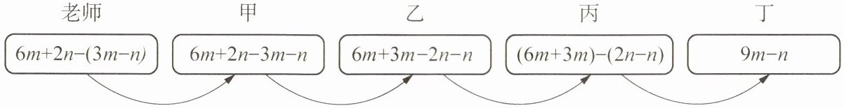 2 老师设计了一个接力游戏,用合作的方式完成化简代数式,规则是:每名同学只能利用前面一个同学的式子,进一步计算,再将结果传给下一个同学,最后解决问题。过程如下: