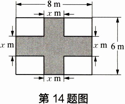 14 小明家有一块长为 8m,宽为 6m 的长方形空地,现准备在该空地上建造一个十字花园(图中阴影部分),并使花园面积为该长方形空地面积的一半,小明设计了如图所示的方案,则图中$x$的值为 。