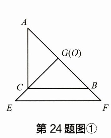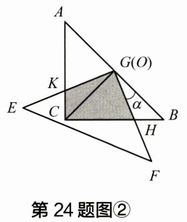 24 如图①,把两个全等的等腰直角三角板$ABC和EFG$(其直角边的长均为 4)叠放在一起,使三角板$EFG的直角顶点G与三角板ABC斜边的中点O$重合(如图①)。现将三角板$EFG绕点O$按顺时针方向旋转(旋转角$\alpha$满足条件:$0^{\circ}\lt\alpha\lt90^{\circ}$),四边形$CHGK$是旋转过程中两个三角板的重叠部分(如图②)。