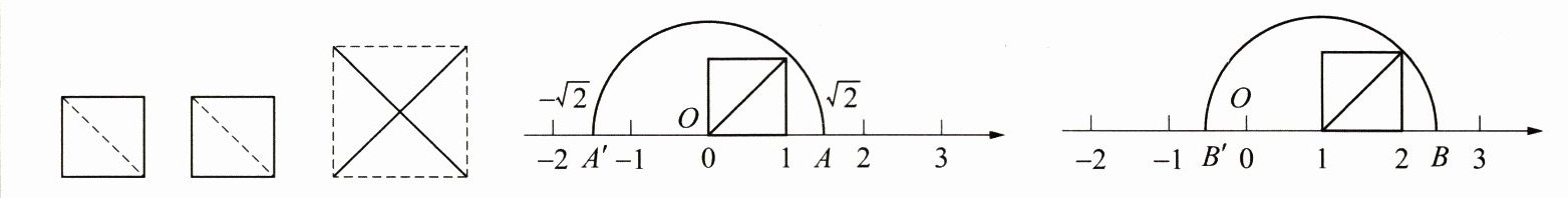 回顾梳理:要在数轴上找到表示 $ \pm\sqrt{2} $ 的点,关键是在数轴上构造线段 $ OA = OA' = \sqrt{2} $。如图①,把两个边长为 1 的小正方形分别沿对角线剪开,将所得的 4 个直角三角形拼在一起,可以得到一个面积为 2 的大正方形,面积为 2 的大正方形的边长就是原边长为 1 的小正方形的对角线长,因此可得小正方形的对角线长为 $ \sqrt{2} $;由此我们得到一种在数轴上找到无理数的方法:如图②,正方形的边长为 1 个单位长度,以原点 $ O $ 为圆心,对角线长为半径画弧与数轴分别交于点 $ A $、$ A' $,则点 $ A $ 对应的数为 $ \sqrt{2} $,点 $ A' $ 对应的数为 $ -\sqrt{2} $。