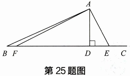 25 如图,$AD\perp BC$,垂足为 $D$,且 $AD = 4$,$BD = 9$。点 $E$ 从 $D$ 点沿射线 $DC$ 向右以 $2$ 个单位/秒的速度匀速运动,同时点 $F$ 从 $B$ 点沿线段 $BD$ 向点 $D$ 以 $1$ 个单位/秒的速度匀速运动,当点 $F$ 到达终点 $D$ 时,点 $E$ 也立即停止运动,连接 $AE$、$AF$,设点 $F$ 运动的时间为 $t$ 秒。