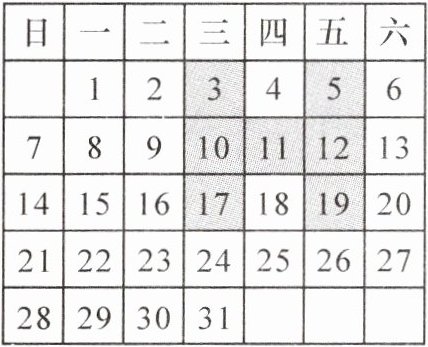 3. (2024·玉林玉州区期中)王涵同学在某月的月历上圈出了三个数 $ a $,$ b $,$ c $,并求出了它们的和为 45,则这三个数在月历中的排列方式不可能是(