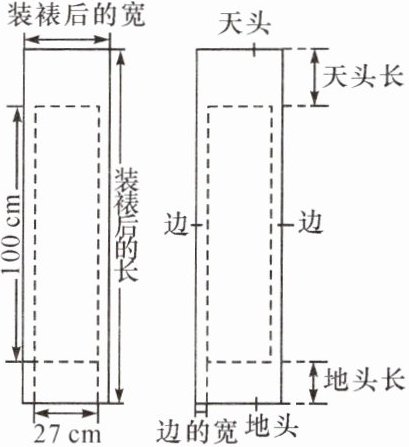 5. (2023·北京)对联是中华传统文化的瑰宝,对联装裱后,如图所示,上、下空白处分别称为天头和地头,左、右空白处统称为边.一般情况下,天头长与地头长的比是 6:4,左、右边的宽相等,均为天头长与地头长之和的 $\frac{1}{10}$.某人要装裱一副对联,对联的长为 100 cm,宽为 27 cm.若要求装裱后的长是装裱后的宽的 4 倍,求边的宽和天头长.