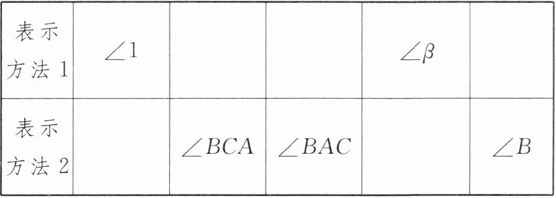 3. 将下图中的角用不同方法表示出来,并填写下表: