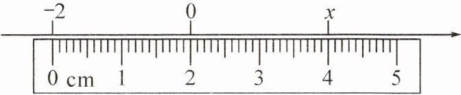 14. (2024·南宁三十七中月考改编)如图,将一把刻度尺放在数轴上(数轴的单位长度是$ 1 \mathrm{cm} $),刻度尺上“$ 0 \mathrm{cm} $”和“$ 4 \mathrm{cm} $”分别对应数轴上的$ -2 $和$ x $,那么$ x $的值为