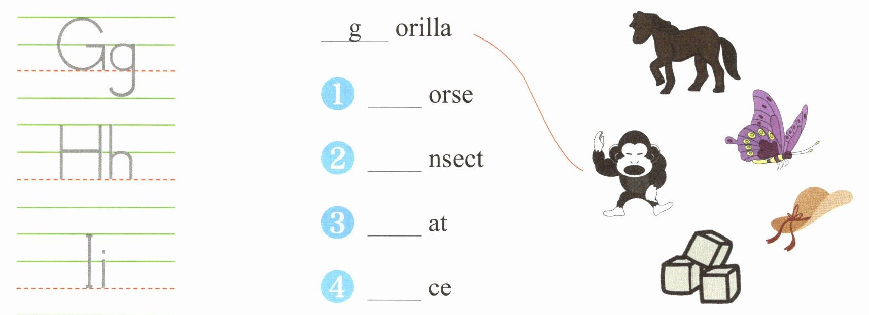 Ⅰ. Trace, write and match(请正确描写下面的字母,然后看图,在横线上填写所缺字母,并仿照例子连线)