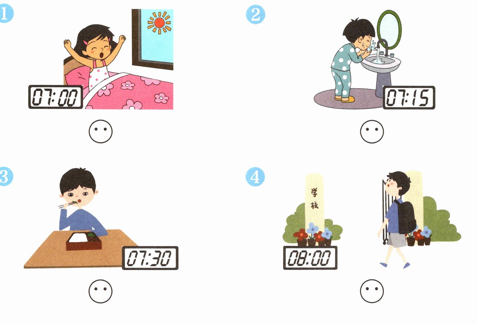 3. I'm Xiaoxiao. I have breakfast at seven thirty. (☺)