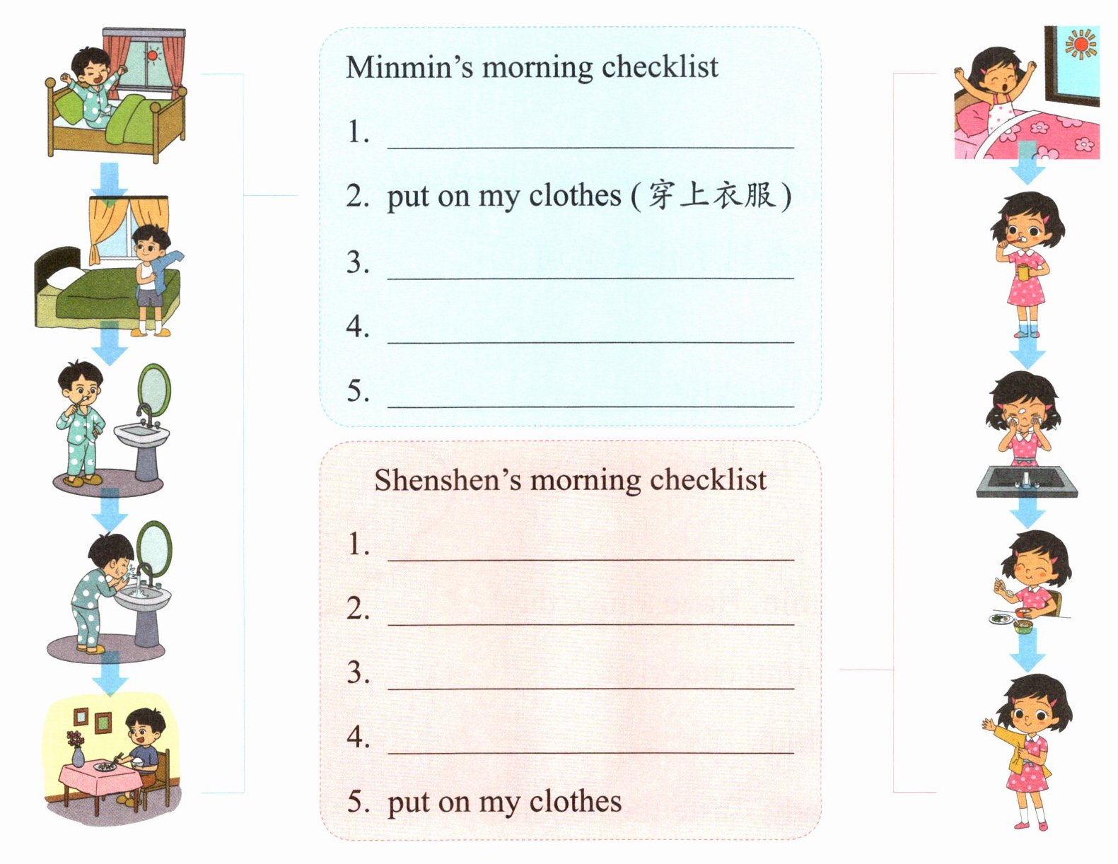 Ⅱ. Write, compare and say(仿照例子写出Minmin与Shenshen早晨做的事,并比较一下,看看顺序有何不同,说一说你喜欢哪一个)