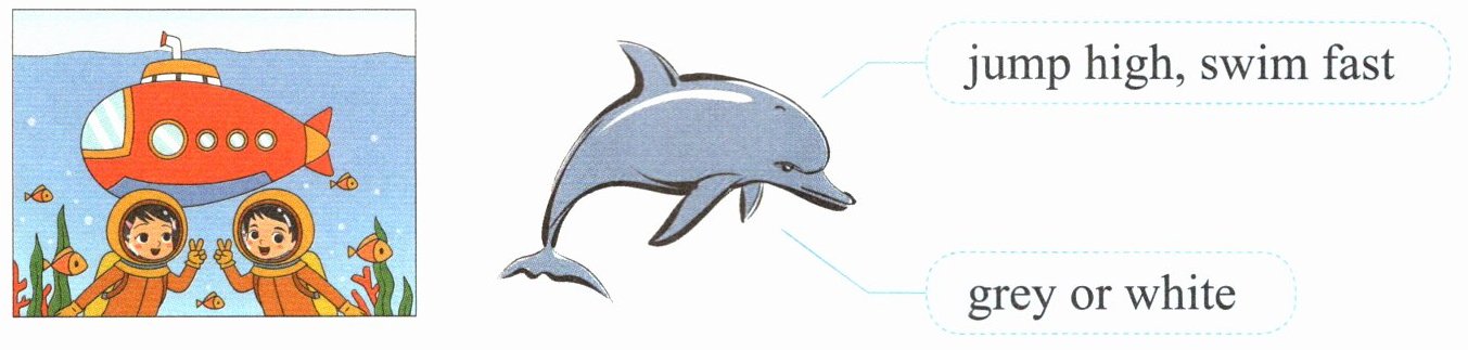 Ⅳ. Look and complete(Shenshen和Xiaopu乘坐模拟潜水艇观察并了解海豚特征,请填写相应的内容完成他们的对话)