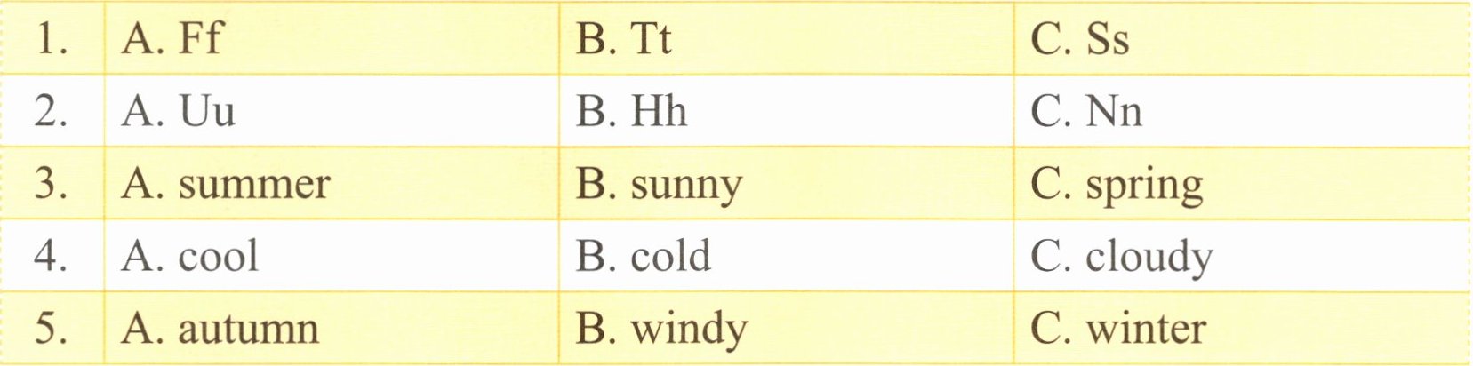 1. Ss (C) 2. Uu (A) 3. spring (C) 4. cold (B) 5. autumn (A)