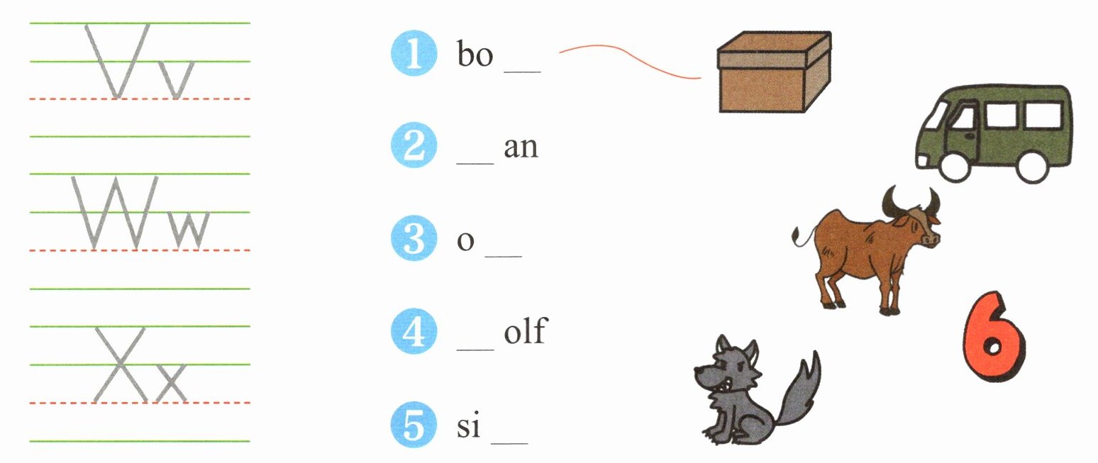 Ⅰ. Trace, write and match(请正确描写下面的字母,然后看图,在横线上填写所缺字母,并仿照例子连线)