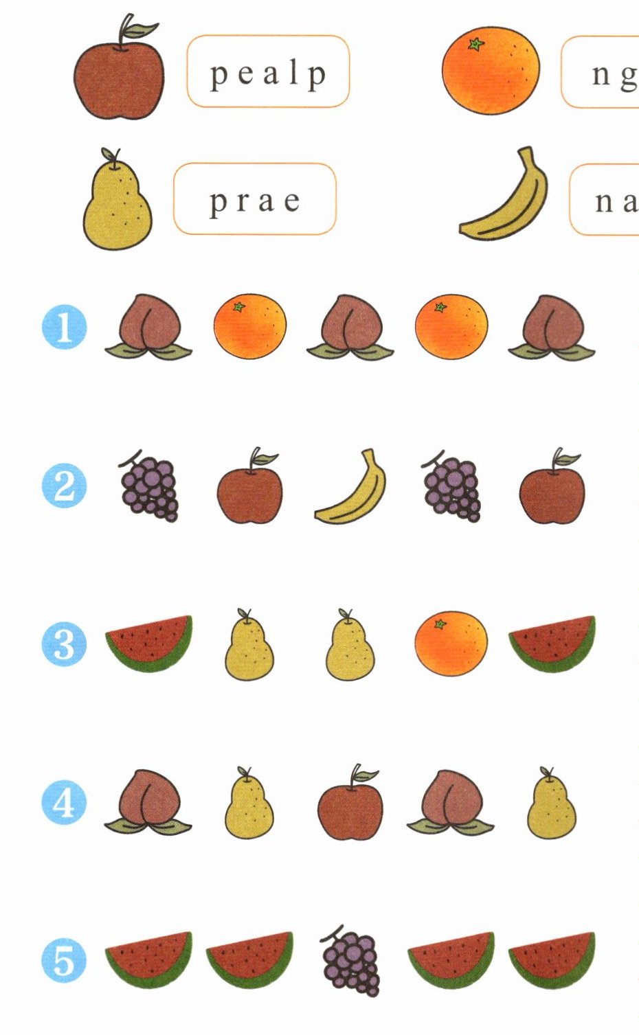 Ⅱ. Look and write(看图,找规律,根据字母提示写出各小题排在后面的水果对应的单词)