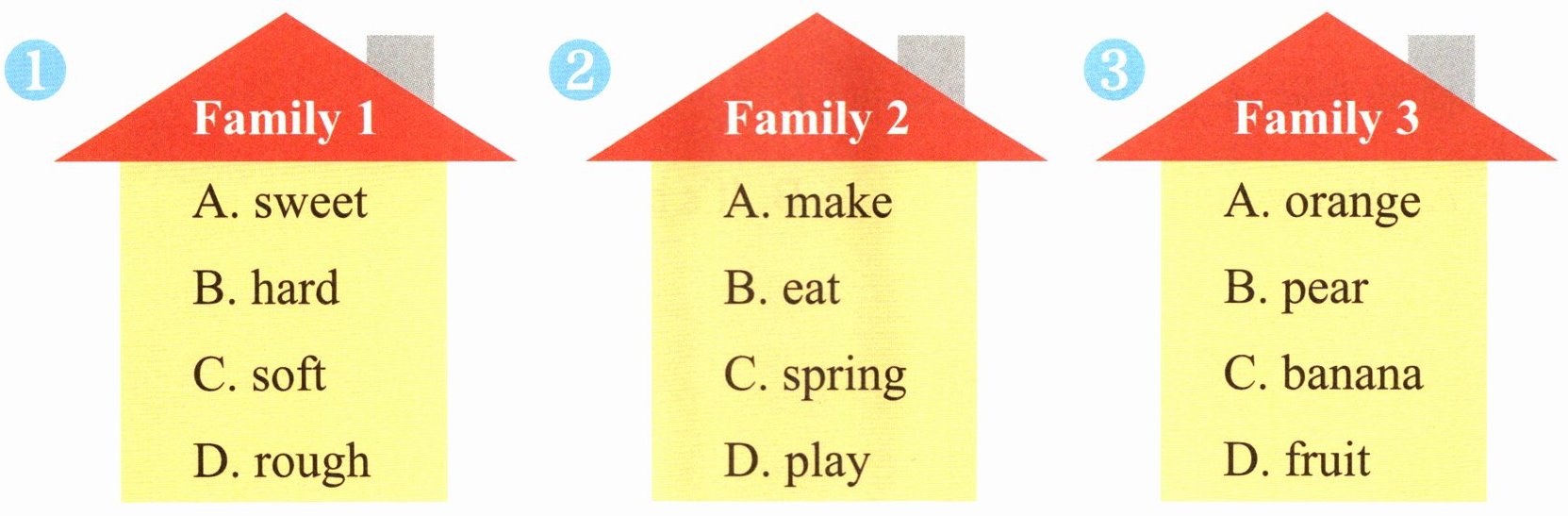 Ⅱ. Read and circle(看看三个家庭中,哪个不是它们的家庭成员?圈出不同类的单词)