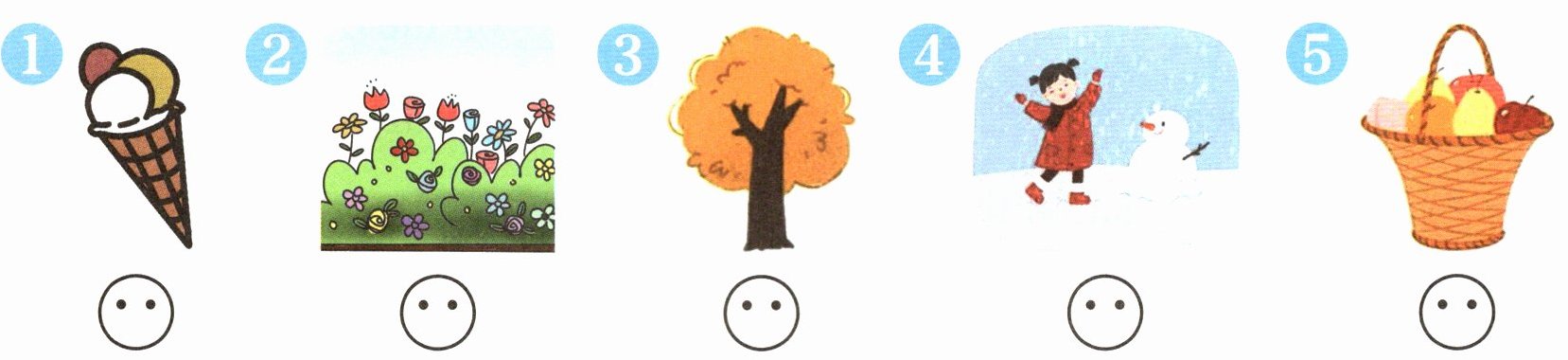 1. In summer, I love to eat ice cream. (☺) 2. I can see beautiful flowers in spring. (☺) 3. In autumn, the tree is green. (☹) 4. I love to play with the white snow in winter. (☺) 5. It's a fruit plate for my mother. (☺)